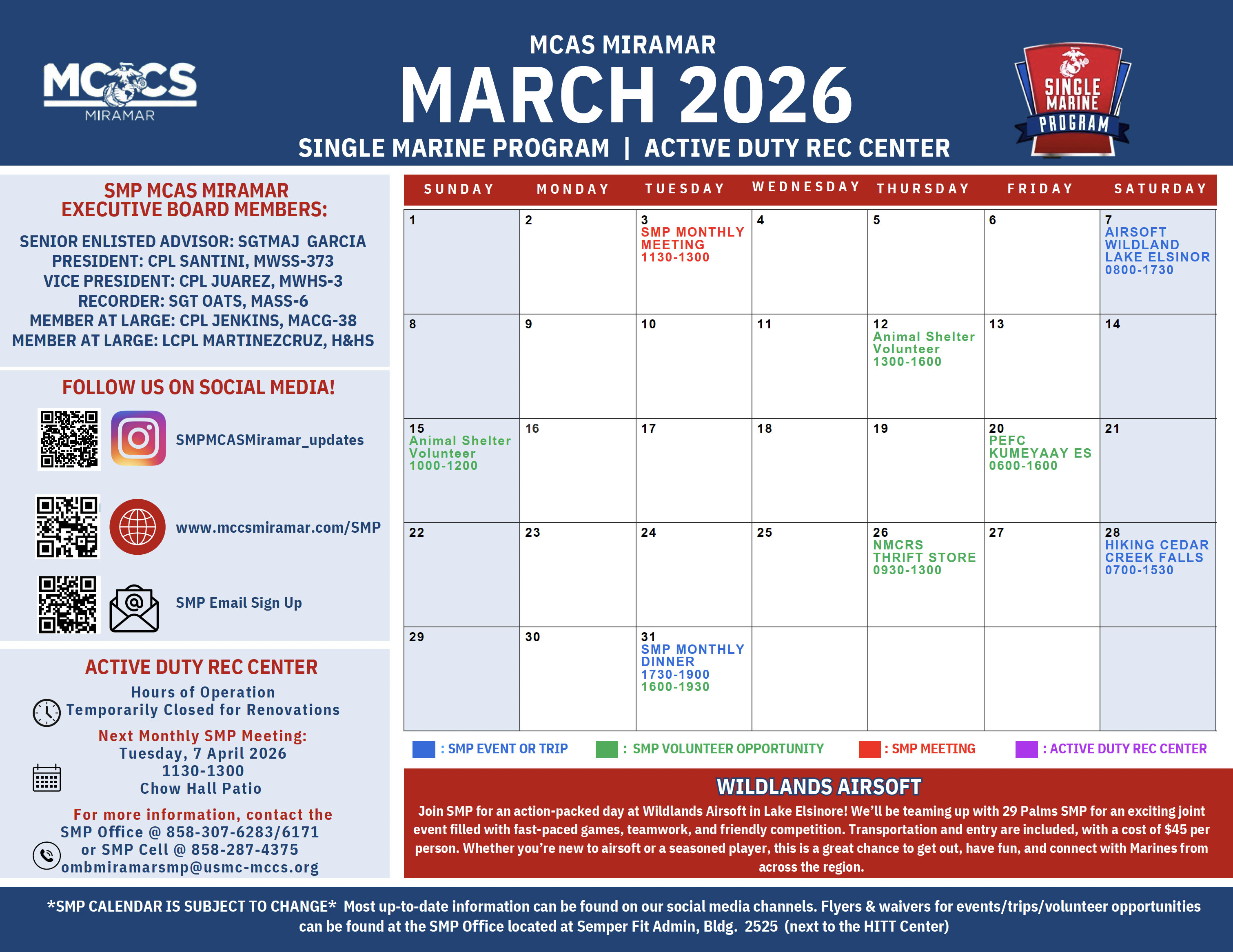 The Single Marine Program at MCAS Miramar provides an invaluable platform for Single Service Members and Geographical Bachelors to connect, grow, and thrive both on and off duty. The SMP team creates memorable experiences through recreational activities, volunteer opportunities, and the means to address and improve Quality of Life (QOL) issues. The program fosters a sense of community and provides essential advocacy, ensuring that the needs and concerns of single Marines are heard and addressed.
